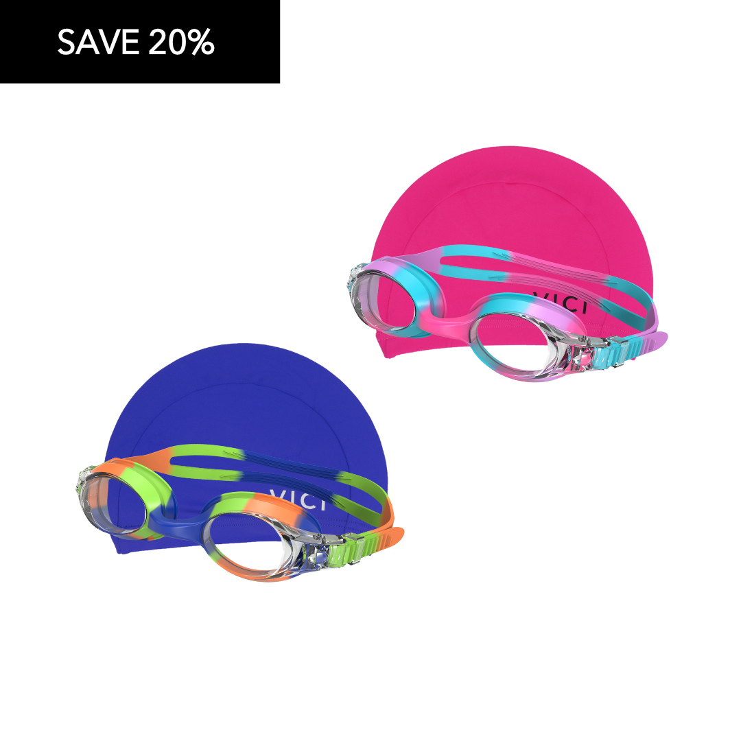 Junior Goggle and Lycra Cap Bundle at 20% off RRP. Suitable for ages 2-10yrs and available in your choice of Blue or Pink